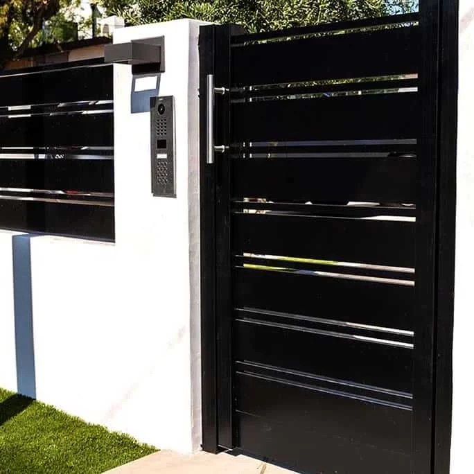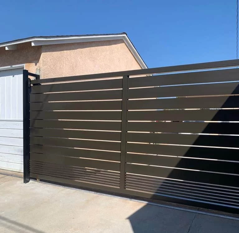 With Access Gates and Doors aluminum fence and gate system the styles and designs are endless. We offer two sizes of aluminum horizontal slats: 5.5″ and 1″. The spacing between the slats can be any size of spacing. With that said, first thing you should choose is the slats sizes (5.5″, 1″ or mix them together). Second, you should choose your spacing between the slats depending on the privacy level you want to archive. Lastly, choose your color: flat black, dark gray or architectural bronze.